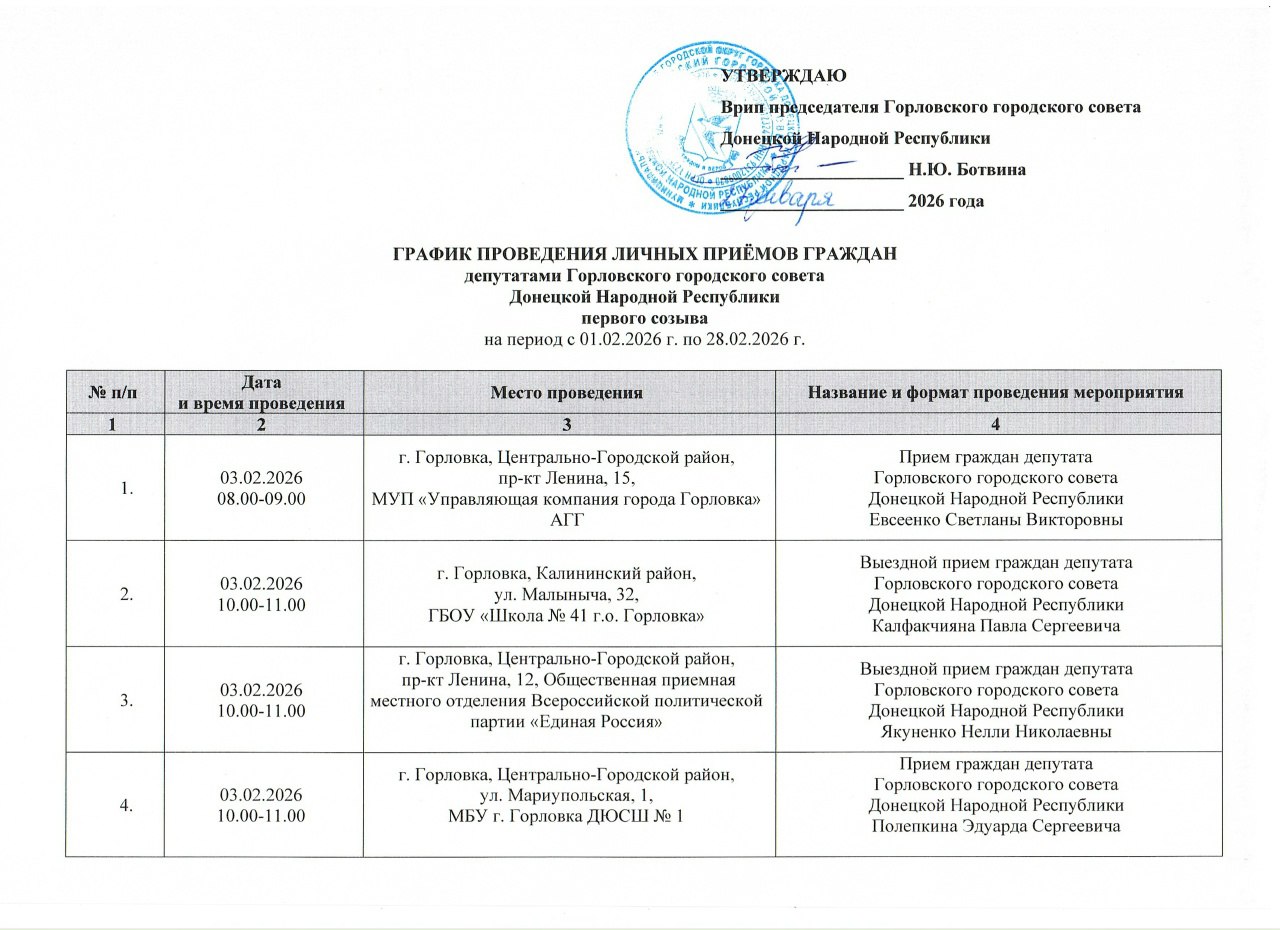 График проведения приёмов депутатами Горловского городского совета Донецкой Народной Республики первого созыва на период с 01.02.2026 г. по 28.02.2026 г. (часть 1)