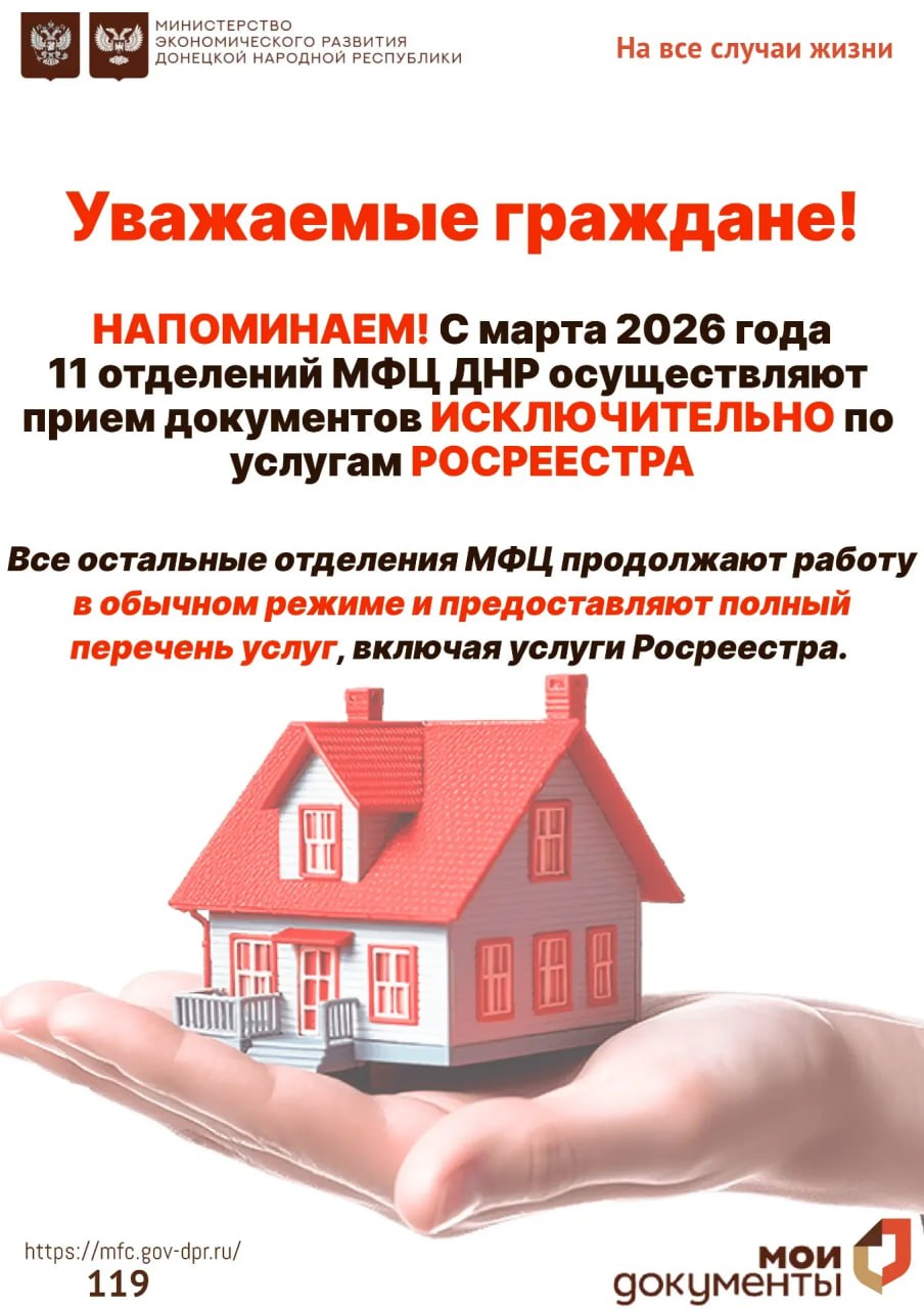 Со 2 марта 2026 года организован временный перевод одиннадцати отделений ГБУ «МФЦ ДНР» в формат «одной услуги» - исключительно для приёма заявлений по государственному кадастровому учёту и регистрации прав на недвижимое имущество.
